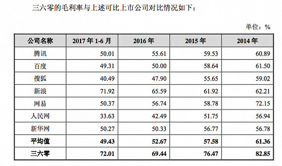 同期,三六零毛利率分别达到82.85%、76.47%、69.44%、72.01%,完全盖过腾讯、百度、搜狐、新浪、网易等一众互联网公司。