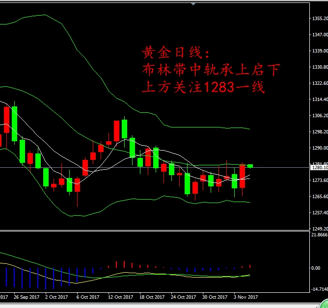 关注上方1283一线的阻力点,如果继续破位这一线,将价格带到布林带中上轨强势区域,那么黄金可能就将迎来一波涨势,不然还将维持在1265-1283区间内的来回走动。更多实时分析、操作建议、解套策略搜苦茶品金博客即可。