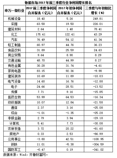 截止10月底,鲁股市场三季报已发布完毕。齐鲁财富网研究中心根据Wind数据,按照申万一级行业标准统计发现,2017年鲁股所在行业前三季度净利润增长最快的是机械设备行业,净利润增长249.81%;其次是采掘行业,净利润增长226.01%,两个行业净利润增长均超过2倍。