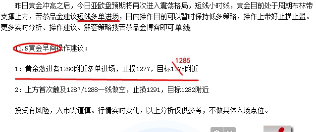 苦茶品金:11.9黄金午后操作分析,早间多单轻松止盈