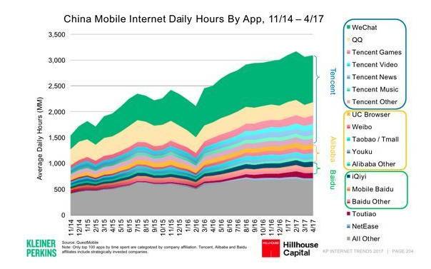 5月,Mary Meeker发布的2017年互联网趋势报告中的数据显示,微信平均一天在中国移动应用程序中占用了约29%的时间:中国用户每天花在移动应用上的时间达31亿小时,而光微信自己就占了9亿小时。
