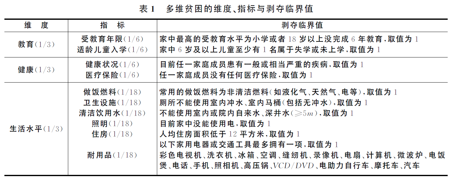 其中H为多维贫困发生率,即 多维贫困人口/总人口;A为贫困人口平均被剥夺程度。