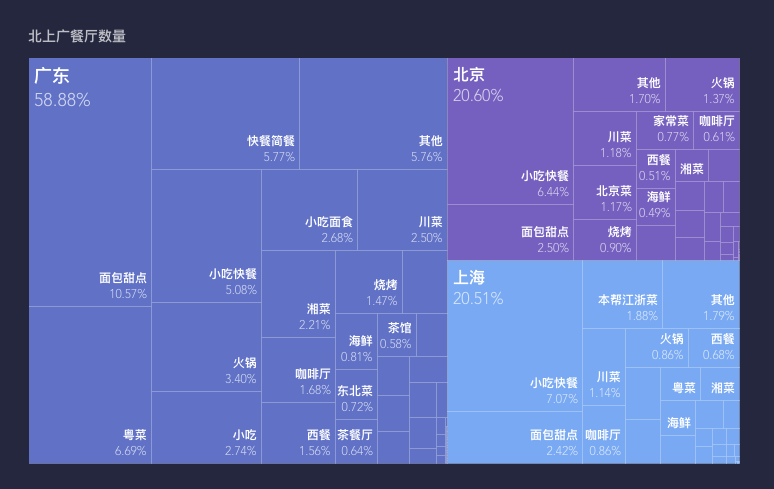 适用场景:在矩形树图中,各个小矩形的面积表示每个子节点的大小,矩形面积越大,表示子节点在父节点中的占比越大,整个矩形的面积之和表示整个父节点。通过钻取情况,可以清晰地知道数据的全局层级结构和每个层级的详情。