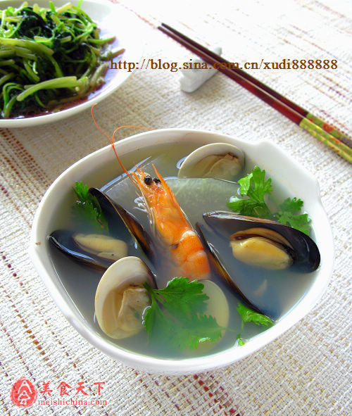 鲜虾、海虹、花蛤、冬瓜、葱姜、香菜。