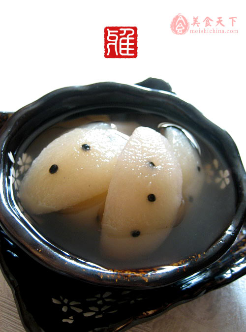 3、将切好的鸭梨,嵌上花椒粒,然后放入生姜水里,加入白糖和蜂蜜,煮至鸭梨看上去透明即可。