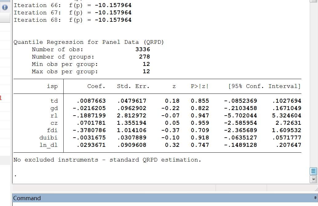 用qregpd命令回归,278个单元,12个年份,但是结果似乎不对。有操作的过得,求教下。谢谢