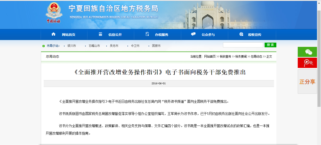 《全面推开营改增业务操作指引》电子书近日由税务出版社在总局内网“税务读书频道”面向全国税务干部免费推出。