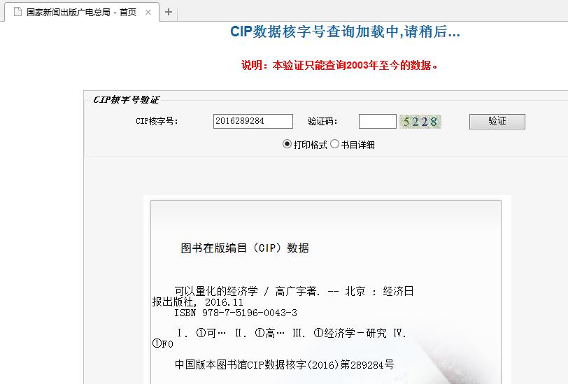 经过3个多月的努力,CIP和ISBN终于下来了,这个可以在新闻出版广电总局(http://www.gapp.gov.cn/utils/cip_capub.shtml)和中国版本图书馆 (http://www.capub.cn/)进行查询来确定真伪。新闻出版广电总局查询好像有点小bug,第一次查询都不成功,需要第二次才能查到。将CIP和验证码输入,然后点击验证就能查询。我的书的ISBN:978-7-5196-0043-3,CIP:2016289284。