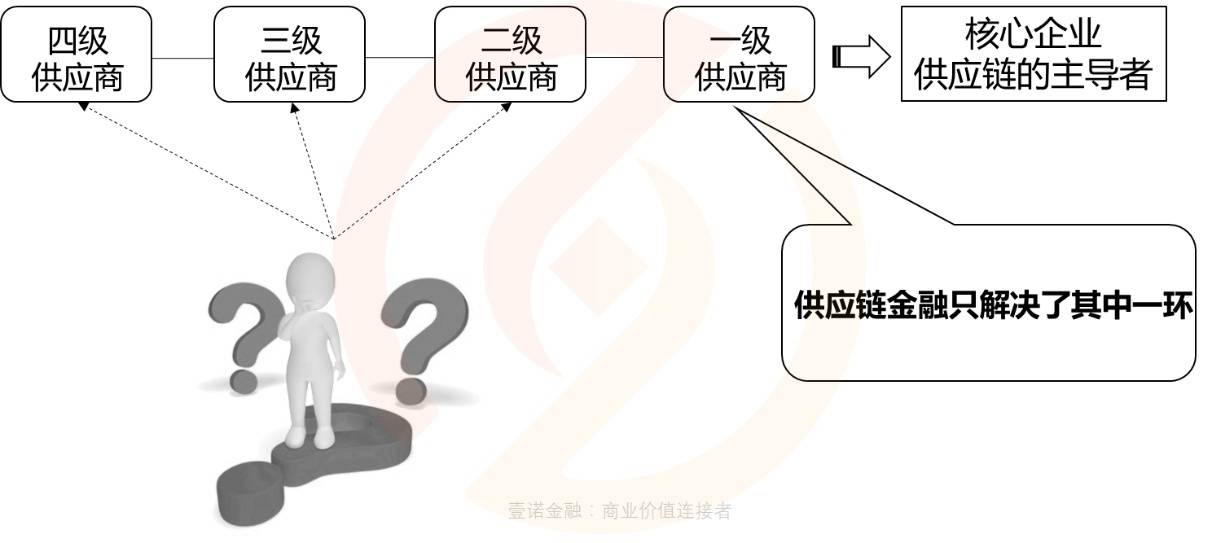 在供应链金融中,最重要的就是依托核心企业的信用,服务其上下游中小企业,但是在多级供应商模式中,一级之后的供应商无法依托核心企业的信用做金融,信用无法传递给需要金融服务的中小企业,造成融资难、融资贵。