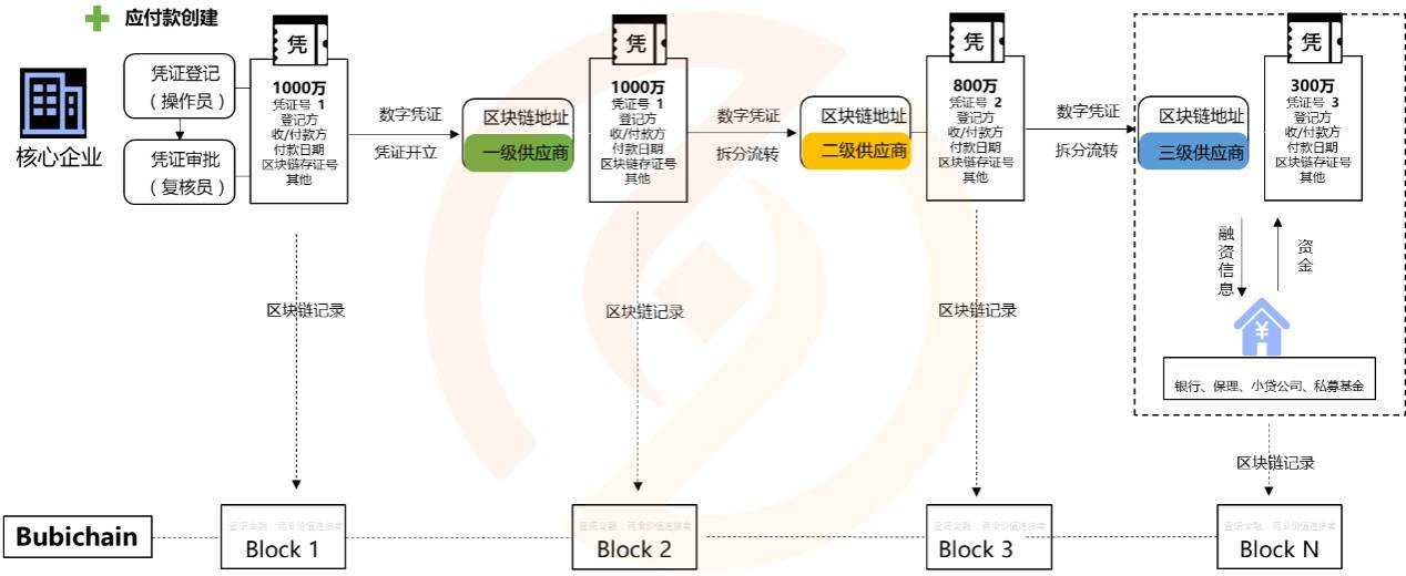 整个链条上的企业债权流转过程记录在链条上,形成合约,且区块链具有不可篡改的特性,核心企业信用经过多个供应商流转后不衰减,核心企业付款后,资金将按智能合约的规则自动化清算,资金提供方有良好的回款保障。