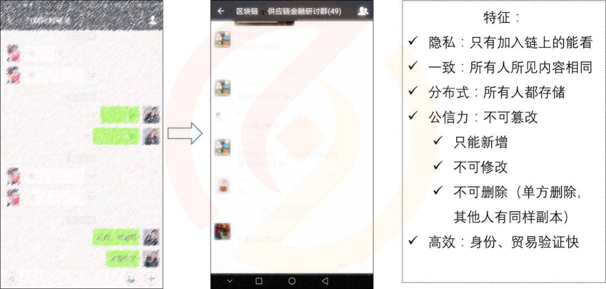 有无区块链的区别。如图4所示,传统体系下,“贸易”和“融资”是两个分离的环节,企业A、企业B做完贸易以后,A拿着贸易信息找银行C融资,银行C担心A提供的信息是否真实,要花费很大的代价来做验证。(用微信做比较,相当于,A、B私聊记录,拿去给银行C看,银行担心真假)。区块链体系下,A、B做贸易的同时,银行C就在“见证”,这样一来,A拿着贸易信息找银行C融资,银行C可以从本地见证到的数据里面核对真实性。(用微信做比较,相当于,A、B、C群聊,银行C本地数据可以验证,且效率高,只要保障身份、交易合约的法律效力)。