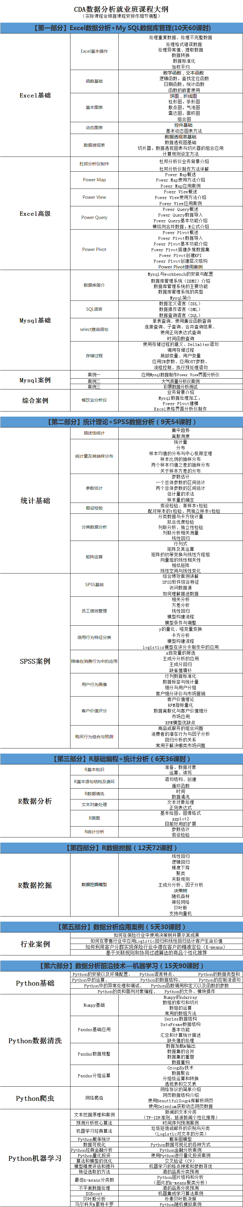 CDA数据分析就业班是为解决当下企业招人难、学员就业难的问题所研发的精品数据分析培训课程。课程以数据分析理论与实践案例结合的方式讲授,内容覆盖了国内企业招聘数据分析师岗位所需的技能,学员经过三个月系统全面的脱产学习(统计学、Excel、SQL、SPSS、SAS、R、Python),达到企业用人标准,快速在大数据时代找准工作定位。