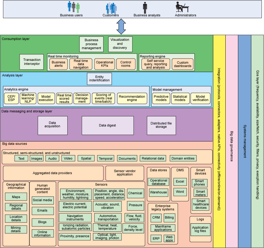 数据改动和存储层:此层负责从数据源获取数据,并在必要时,将它转换为适合数据分析方式的格式。例如,可能需要转换一幅图,才能将它存储在 Hadoop Distributed File System (HDFS) 存储或关系数据库管理系统 (RDBMS) 仓库中,以供进一步处理。合规性制度和治理策略要求为不同的数据类型提供合适的存储。