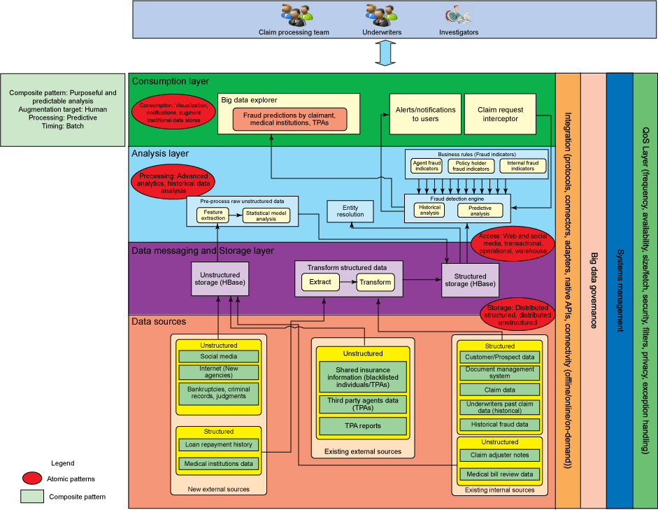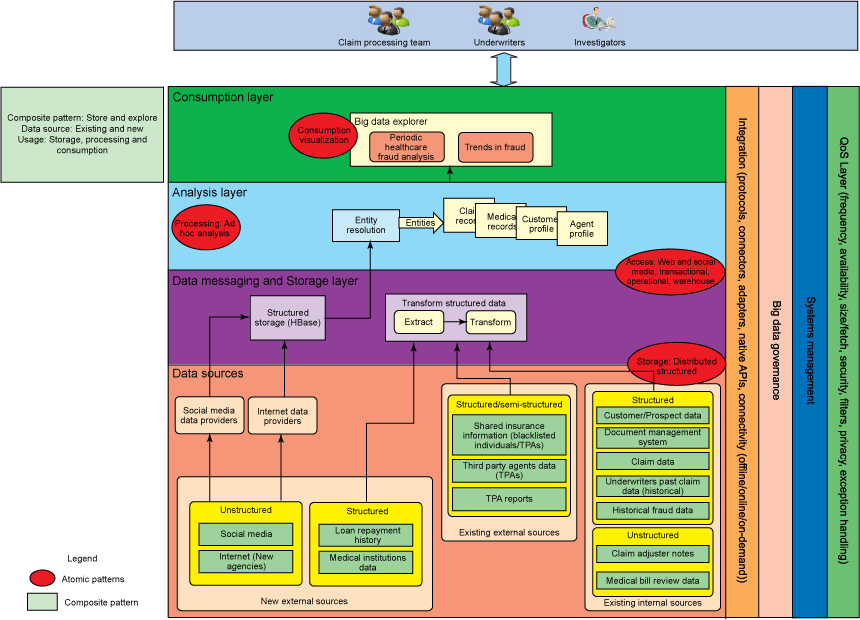 医疗保健欺诈检测所需的数据可以从不同的数据源和系统中获得,比如银行、医疗机构、社交媒体和 Internet 机构。这些数据包括来自博客、社交媒体、新闻机构、各机构的报告,以及 X 光报告等来源的非结构化数据。更多示例请参见图 1 中的数据源层。利用大数据分析,这些不同来源的信息可相互关联和组合,并且被分析(在已定义规则的帮助下),以确定欺诈的可能性。