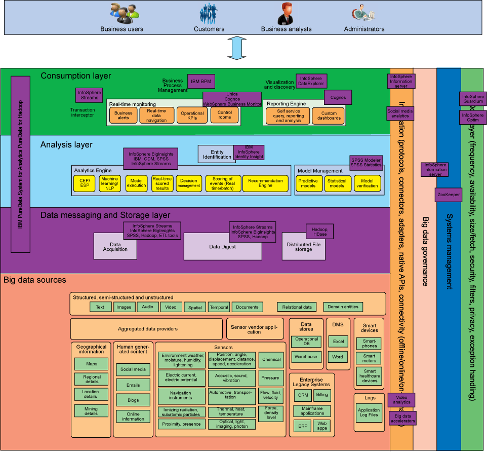 图 4 显示了大数据设备,如 IBM PureData™ System for Hadoop 和 IBM PureData System for Analytics,它们跨越多个层次。这些设备具有内置的可视化、内置的分析加速器,以及单一系统控制台等特性。使用设备有很多优点。(请参阅 参考资料,了解有关 IBM PureData System for Hadoop 的更多信息。)