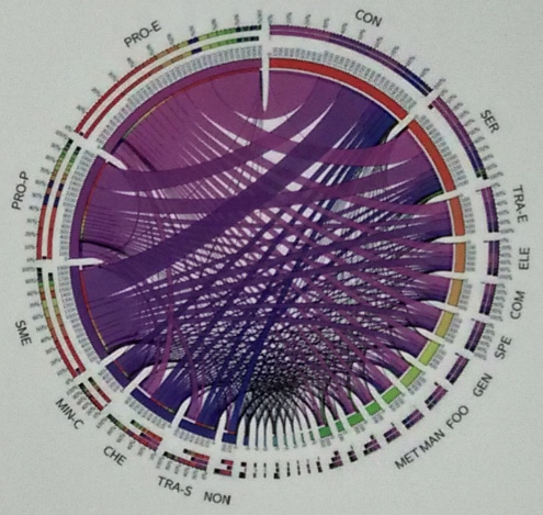 voodoo 发表于 2017-11-23 22:43 这种图叫作Chord diagram,R中实现参见http://zuguang.de/circlize_book/book/