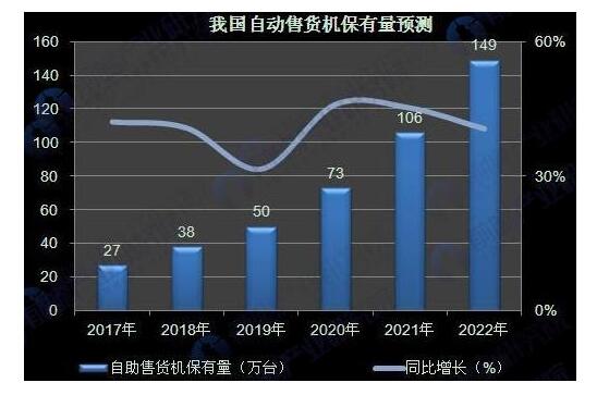 根据国外发展经验,中国内地售货机应用市场启动期至少应布机10万台,年生产总值在10亿元人民币,到发展期至少应布机50万台,年生产总值应达到100亿元人民币,而到成熟期将达到300万台,年生产总值将达到600亿元之巨,届时中国的自动售货机将发展成为一个巨大的产业,中国的自动售货机产业将实现快速增长,初步估计自动售货机的年投放量将达到10万到20万台,年产值增长20-40亿元人民币,预计到2022年,我国自助售货机保有量达到149万台。