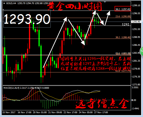 昨日受美指走弱金价一度上破1299,随后上演高台跳水,但昨日整体还是维持上行态势。早间开盘1293.90,低点1292.80,高点1296.90,现报1294.20。短线上看,黄金日线圆弧底形态持续震荡偏向上行,低点不断拉升,但未能对震荡区间高点1306阻力位形成有效突破,说明日内偏向回调蓄势整理再次向1296上方冲击。