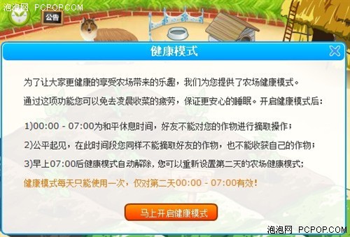 泡泡网软件频道11月7日 “今天我又偷了几个苹果”,“昨天晚上我偷了朋友好多薰衣草”...每天早上一到公司总是听到邻座的几个MM不停的在讨论种菜、偷菜。QQ农场的痴迷玩家们为了能够偷得好友辛苦种下的菜,不惜熬夜守候或是上好闹铃定时爬起来去收菜,这些行为让许多旁观者匪夷所思。不过由于偷菜成瘾,近日不断有新闻报道一些玩家的不幸遭遇,于是引起了大家的广泛关注。现在QQ终于有所行动了,推出了健康模式,让玩家晚上放心休息不必惦记自己的菜园了。