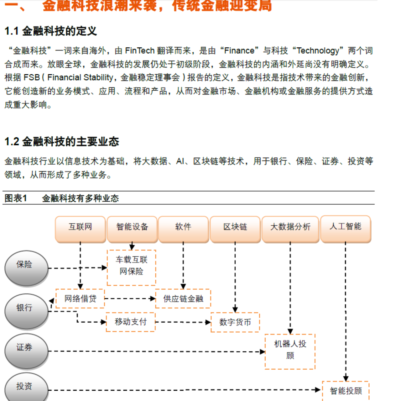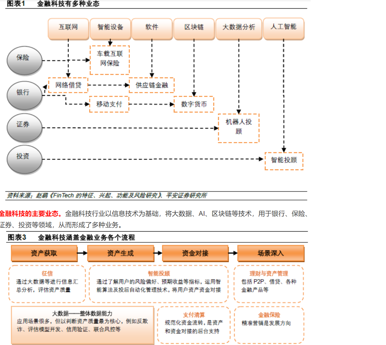 金融科技的主要业态。金融科技行业以信息技术为基础,将大数据、AI、区块链等技术,用于银行、保险、证券、投资等领域,从而形成了多种业务。