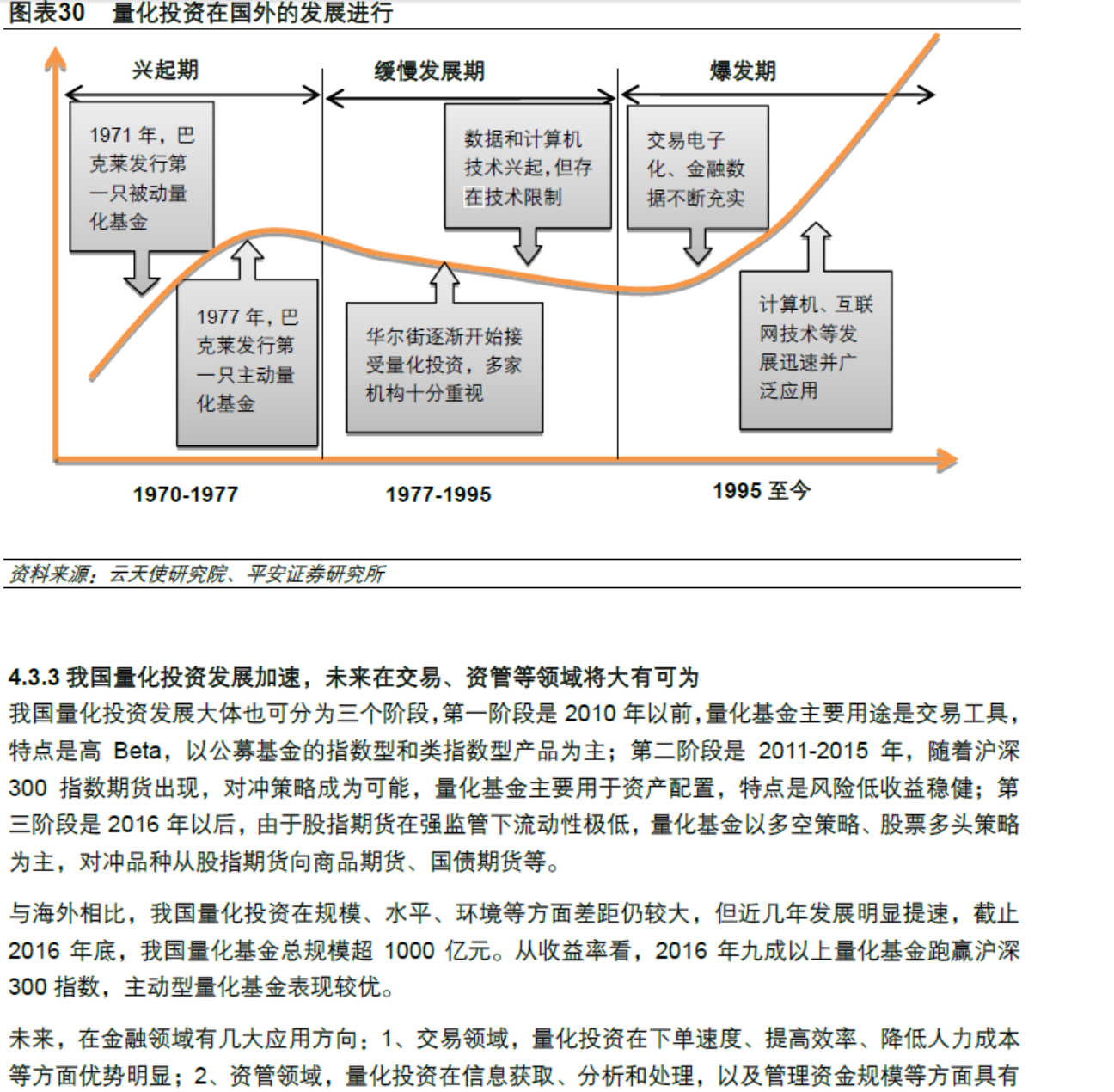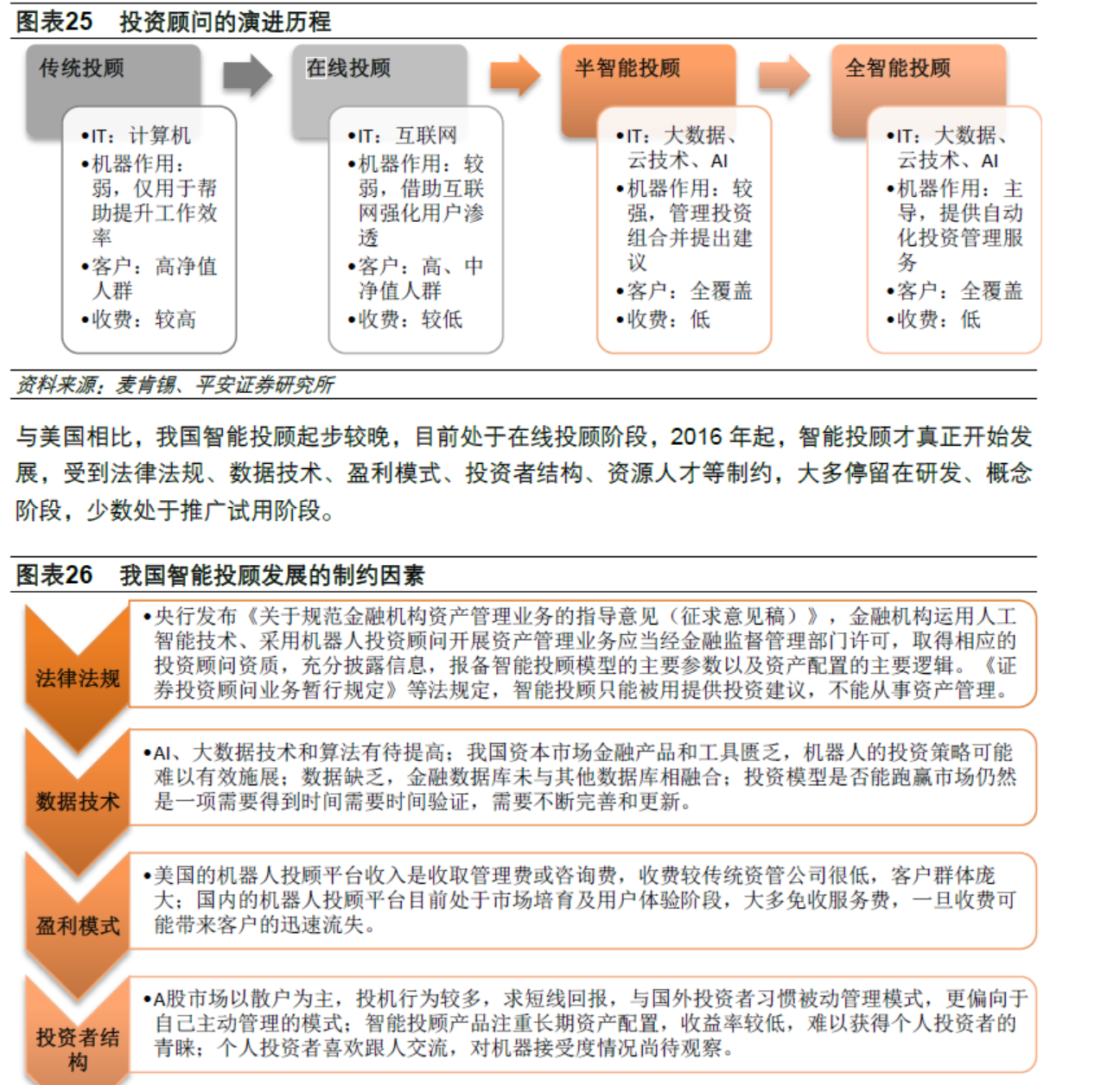 金融科技发展三阶段。根据IOSCO(国际证监会组织)于2017 年2 月发布的《金融科技研究报告》,根据美国的情况,从新兴科技和创新商业模式演进两个方面,将金融科技的发展历程分为三个阶段。金融科技1.0的标志是金融机构内设IT机构,用来提高金融机构的运营效率,比较典型的是银行的信贷系统、清算系统。金融科技2.0的标志是移动互联网的应用,比较典型的是移动支付、P2P、互联网保险等。金融科技3.0的标志是IT新技术例如大数据、云计算、人工智能、区块链等与金融紧密结合,在信息采集、投资决策、风控等方面带来传统金融的变革,比较典型的是大数据征信、智能投顾、供应链金融等。