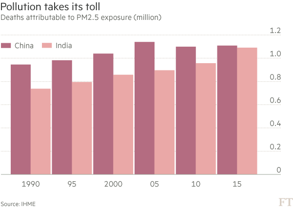 美国研究机构“健康影响研究所”(HEI)发现,2015年,中印两国因空气污染而过早死亡的人均为110万人左右,印度仅比中国少1.8万人,空气污染也由此成为各种健康风险中的第五大致死因素。