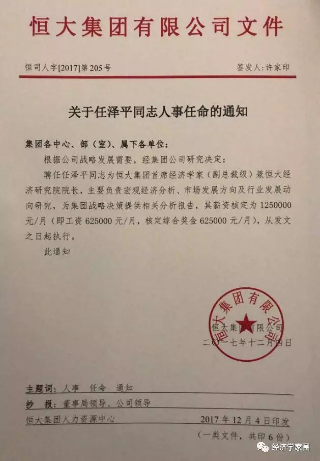 根据内部人士透露,目前关于文件已经下发。内容显示,“根据公司战略发展需要,经集团公司研究决定:聘任任泽平同志为恒大集团首席经济学家(副总裁级)兼恒大经济研究院院长,主要负责宏观经济分析、市场发展方向及行业发展动向研究,为集团战略决策提供相关分析报告,其薪资核定为1250000元/月(即工资625000元/月,核定综合奖金625000元/月),从发文之日起执行。”