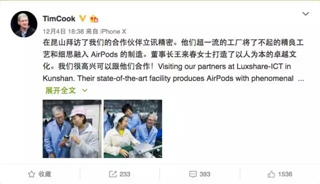 12月4日,库克在微博上透露了自己到昆山拜访苹果合作伙伴立讯精密的消息,据了解,立讯精密是苹果Air Pods的代工厂。
