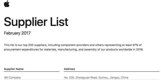 2017年2月,苹果公司公布了世界前200家苹果零部件材料、生产、和整机组装供应商。在这份名单中,中国企业就超过了60家,其中,最著名几家公司包括富士康、比亚迪这样的组装代工厂,还包括蓝思科技、立讯精密、安洁科技、歌尔股份、欧菲科技等A股上市公司。