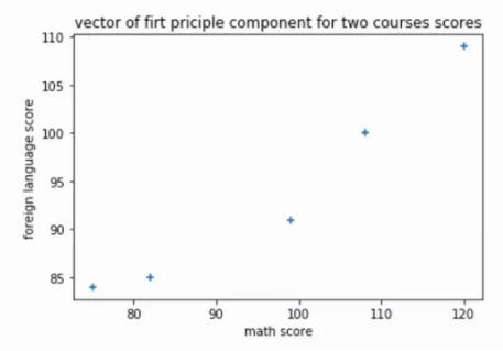 我们还是拿高三101班的数学和外语的分数,要完成排名任务时,现在要对这批数据由二维降为一维,学生们的分数为了表达和书写的方便,拿出5个样本,矩阵 X的形状为:5个样本点2列特征,