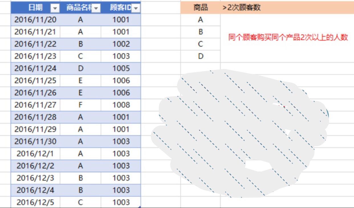 销售订单表,每一条都是一笔订单,每种商品都有很多顾客购买,比如A商品,有的顾客买了1次,有的买了2次、3次...我们想求购买2次以上的人数怎么求呢?