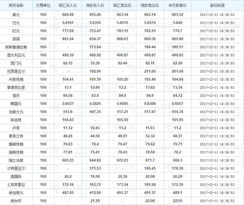 中国银行外汇牌价 2017-12-11(图片来源:东方财富网)