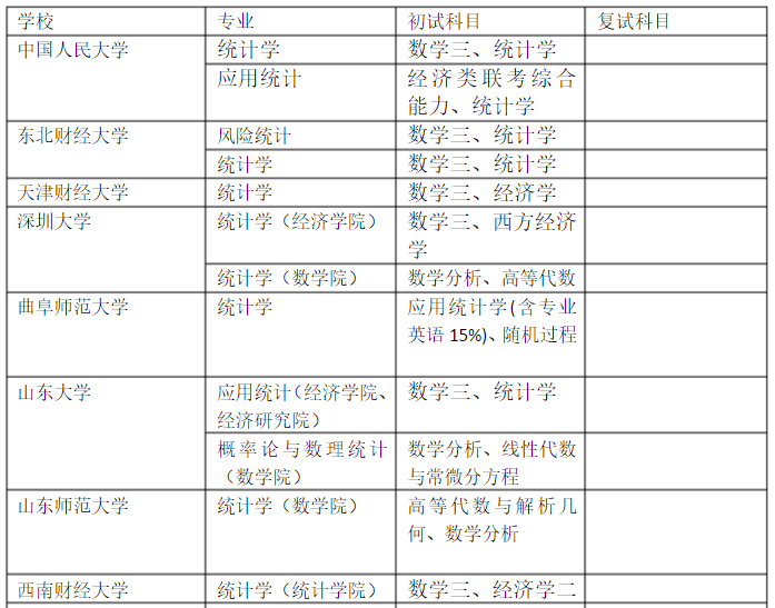 对于统计学和其他专业课程主要集中在统计学、经济学这两门和类似的课程中,这里还是要看报考学校的要求。此外,像华东师范大学的统计学学术型硕士是考数学分析和高等代数的,相对更数学化和理论化一点。但像这种靠数学专业课的统计学毕竟是少数,更多的是自己学校命题的统计学(可能包括学校自己使用的《统计学》教材,以及经济学教材,甚至还有可能涉及到概率论和抽样调查等课程),还有就是全国同一命题的数学三,也就是经济类的数学,相对也较为简单。以下是各大院校统计学考研初试考试科目: