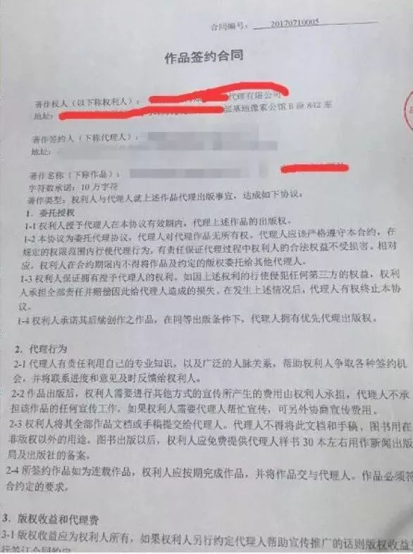 记者在上述合同里看到,“权利人”授予代理人“在本协议有效期内,代理上述作品的出版权”,而代理人则“有责任利用自己的专业知识,以及广泛的人脉关系,帮助权利人争取各种签约机会,并将联系进度和意见及时反馈给权利人”。