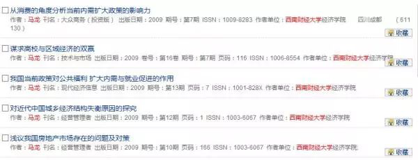 读秀网检索西南财经大学经济学院马龙发表的期刊论文