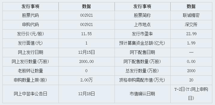 12月15日,联诚精密(002921)进行公开申购,据wind数据显示早在11月10日公司即已成功过。此次公司网上公开发行2000万股,发行价格11.55元/股,发行市盈率为22.99倍,网上发行融资额为2.31亿元。