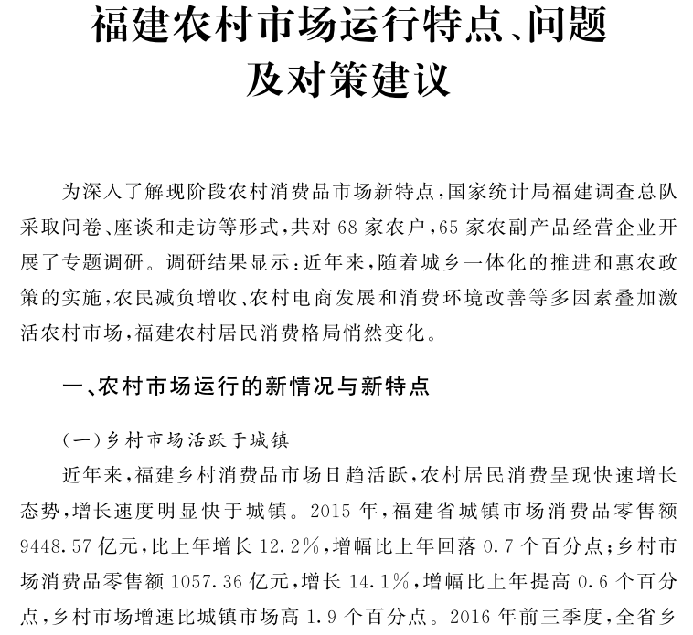 为了更好展示福建调查队系统一年来的分析研究成果,我们遴选了 53 篇文章,编辑出版了《福建调查分析报告—2016》。全书共分为五章,第一章,三农观察 ; 第二章,三新追踪 ; 第三章,民生聚焦;第四章,企业监测;第五章,区域视角。