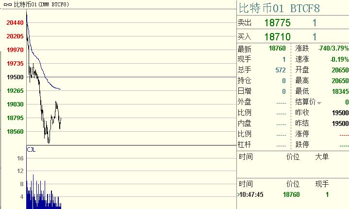 12月18日,美国东部时间周日晚6点,世界上最大的期货交易所——美国芝加哥商业交易所(CME)正式上市比特币期货合约,近期合约1801合约开盘报价20650美元,截止18日上午10点,比特币期货01合约开盘下行,收于18755 美元。比特币期货是以比特币价格为标的的标准化合约。