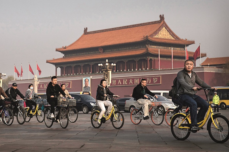 3月29日,北京,上班族们骑着共享单车经过天安门广场。