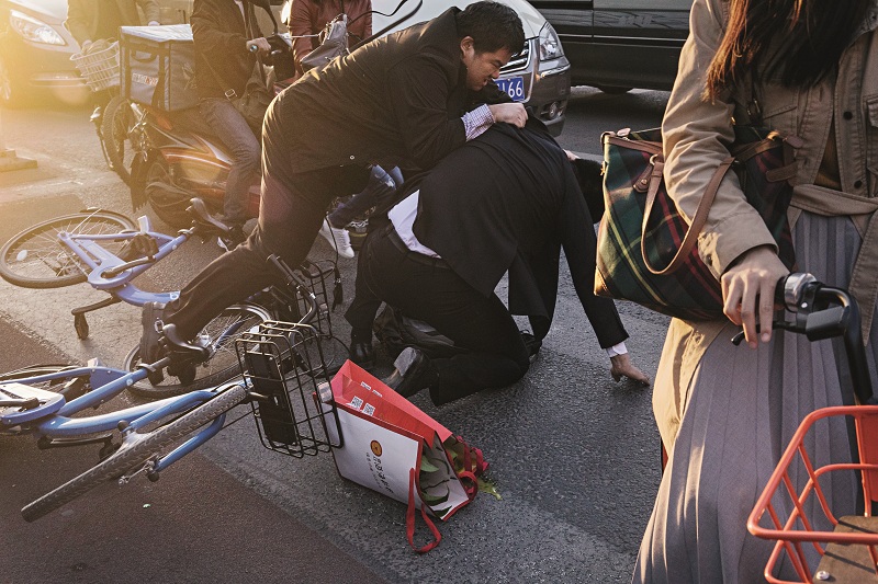 4月11日,北京,两个上班族因为撞车扭打起来。