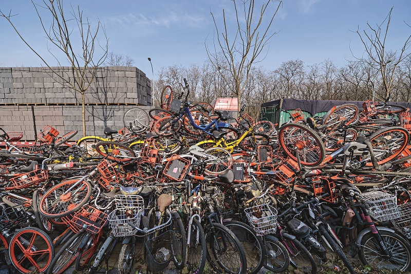 12月8日,北京朝阳大悦城附近,共享单车因违规停放被统一收集,堆积如小山。