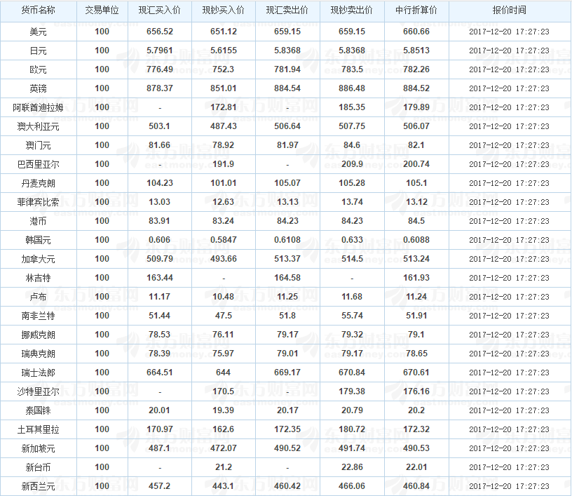 中国银行外汇牌价 2017-12-20(图片来源:东方财富网)