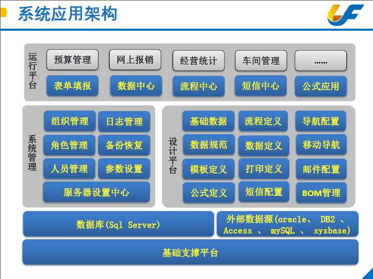 利用外部数据源,实现企业应用集成,支持“Access”、“MSSQL”、“Oracle”、“MySQL”、“SqlAnywhere”、“Sybase” 以及“DB2”七种数据源类型。