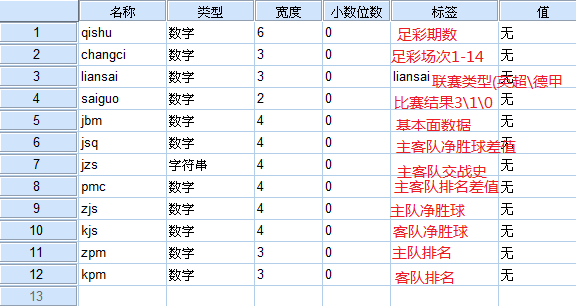 鄙人足彩爱好者,平时有搜集数据用EXCEL进行简单分析研究,用来做14场和九场胜负彩的参考,偶然接触到SPSS,发现功能很强大,所以想用它来做分析,无奈基础太差,很多概念还搞不清楚,所以只好来论坛求助,希望各位大神不吝赐教!附件表格式平时用来研究用的基本数据,B,C,E,F,G,H(绿色)列是自己采集的数据,D列(红色)是已有的球赛结果(3,1,0三种结果,代表胜\平\负),目前17181期留空的单元格(D3866-D3879)是需要分析预测,我平时是在EXCEL中是用B\