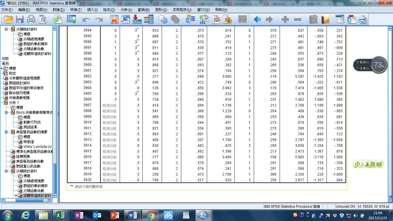 自己研究了下,用分析-分类-判别功能,指定分组变量(SAIGUO),然后指定自变量(B\C\E\F\G\H列自由组合测试),得到预测结果,总算是有些眉目,大致看了下预测结果和真实结果相比,没有冷门时预测正确率有时还挺高,少数冷门也可以预测到,但是总体预测的成功率不能直观的看到,虽然导出到EXCEL中也可以算到,但是有直观的统计结果更方便些,因为要对比不同自变量组合的总体的正确率,有大神知道怎么实现吗?另外分析的报告中函数1和函数2的区别评分的指导意义是什么,有大神可以指导下吗?不胜感激!