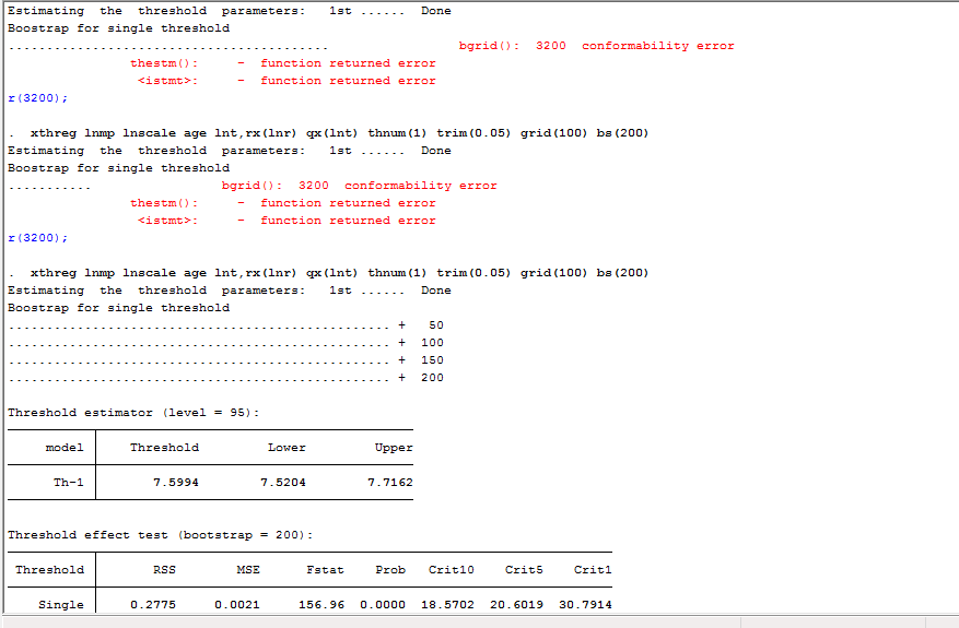 黄老师,我对东部沿海的12个城市,12年的数据,一共144个观测值,是平衡面板,且无缺失值,做面板门槛回归,一直报错