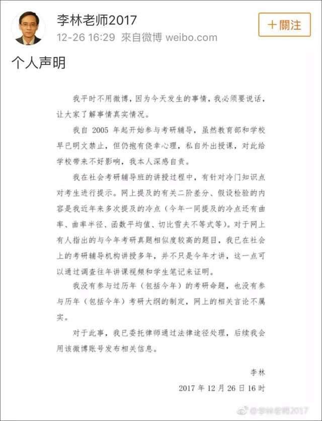 被卷入泄题事件的李林在新浪微博发布个人声明称:网上提及的考题内容系近年多次提及,其本人自2005年开始考研辅导,虽教育部和学校严令禁止,但怀着侥幸心理,私自外出授课,对学校造成不良影响,深感自责。他声明还称并未参加历年的考研命题,网上相关言论不属实,并已委托律师交于法律途径处理。