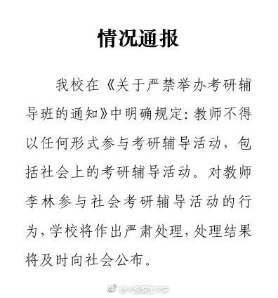 李林任职的@大连理工大学在微博发布情况通报称“学校在《关于严禁举办教研辅导班的通知》中明确规定,教师不得以任何形式参与考研辅导活动,包括社会上的考研辅导活动。对教师李林参与社会考研辅导活动的行为,学校将作出严肃处理,处理结果将及时向社会公布。 ”