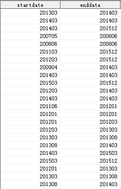 date分别是201303, 201304,201305,201306........201401,201402,201403这些行,而右边变量是不变的跟“startdate=201303, enddate=201403”这行的右边保持一样。