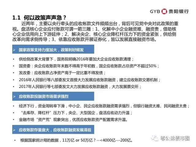 近两年,主要以央行牵头的应收帐款文件频频出台,背后可见党中央对此政策的重视。盘活核心企业应付账款可谓一箭三雕:1、化解中小企业融资难、融资贵,借助核心企业信用向上下游延伸;2、解决央企、核心企业降杠杆压力下的资金紧张,供给侧改革向需求侧传导;3、依靠应收账款开展证券化,皆以发展直接融资市场。
